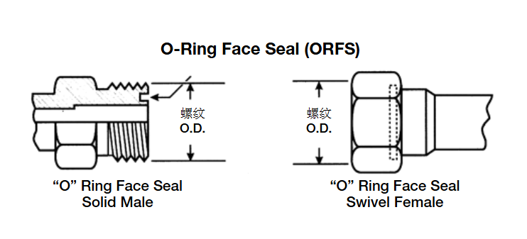 外螺紋接頭上有直螺紋和加工出的平面。內螺紋接頭上也有直螺紋和加工出的平面。通過擠壓平面間的O型圈來實現密封,類似于對開法蘭接頭。螺紋實現機械連接。