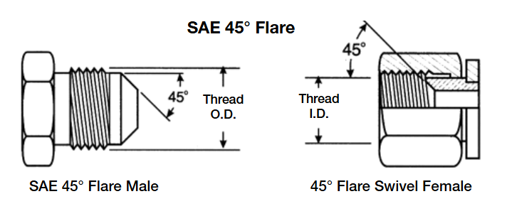 這項通常適用于有45°擴口或錐面的接頭。此密封型式通常用于軟銅管,因為軟銅管比較容易擴成45°角。這通常用于低壓應用,如電冰箱、汽車、卡車管件系統等。SAE 45°外錐僅于SAE 45°內錐匹配。