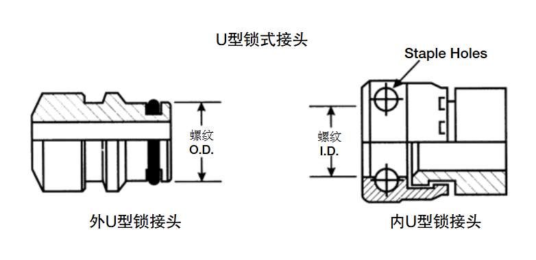 這是徑向O形圈密封,通常用于地下礦井的液壓系統。外接頭包括O形圈和擋圈,加上一個放U型卡的槽。內接頭有放U型卡的兩個孔。