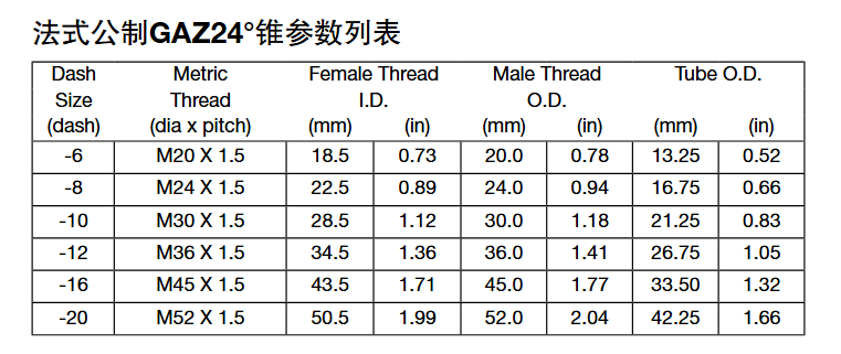 GAZ Poclain 24錐法蘭法式公制GAZ24錐參數列表