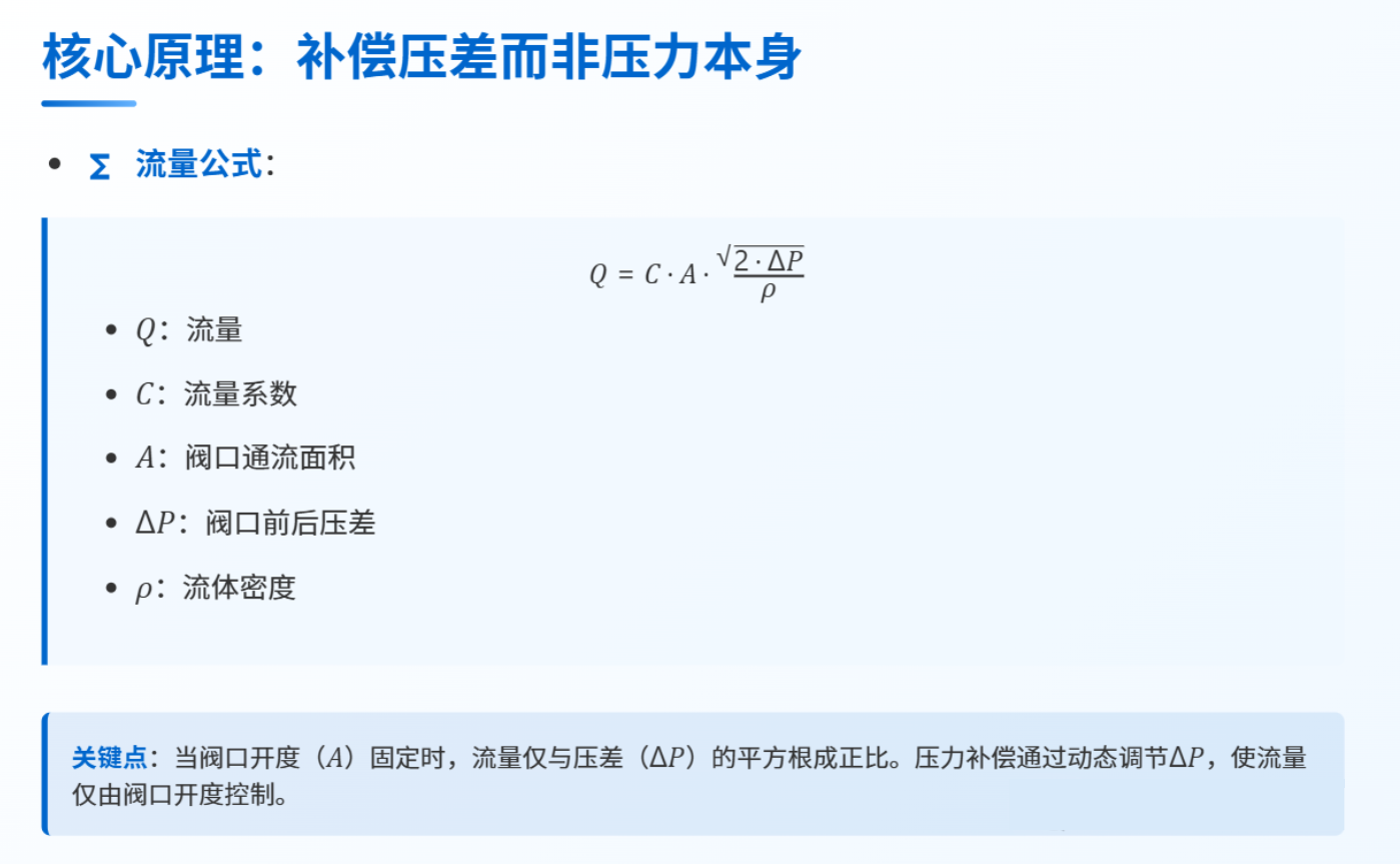 補(bǔ)償壓差而非壓力本身,當(dāng)閥口開(kāi)度固定時(shí),流量?jī)H與壓差的平方根成正比