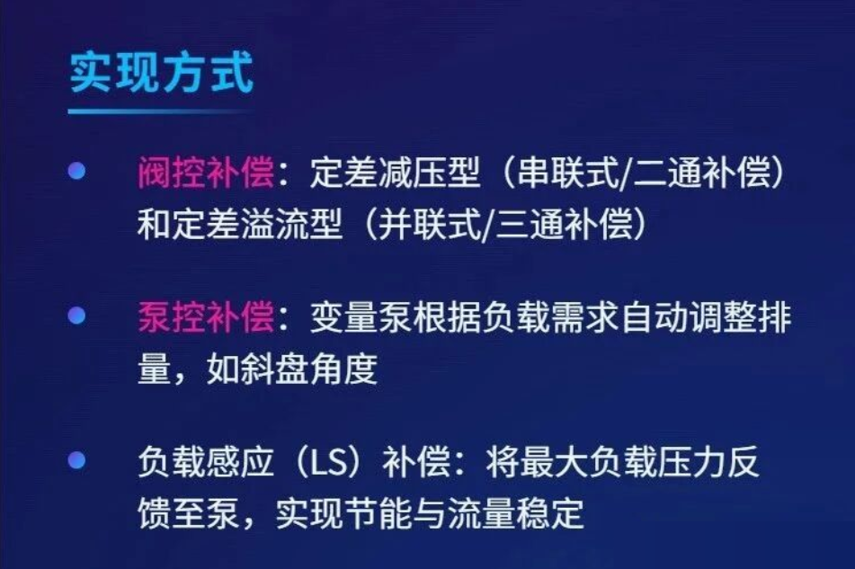 為了解決這一關(guān)鍵問(wèn)題,確保執(zhí)行元件在負(fù)載變化時(shí)仍能獲得相對(duì)恒定的流量(從而保持穩(wěn)定的速度),工程師們引入了壓力補(bǔ)償這一核心技術(shù)。壓力補(bǔ)償是指液壓系統(tǒng)中采取特定措施,主動(dòng)抵消或平衡因負(fù)載變化引起的壓力波動(dòng),從而維持關(guān)鍵工作參數(shù)(特別是流量)相對(duì)穩(wěn)定的過(guò)程和方法。
