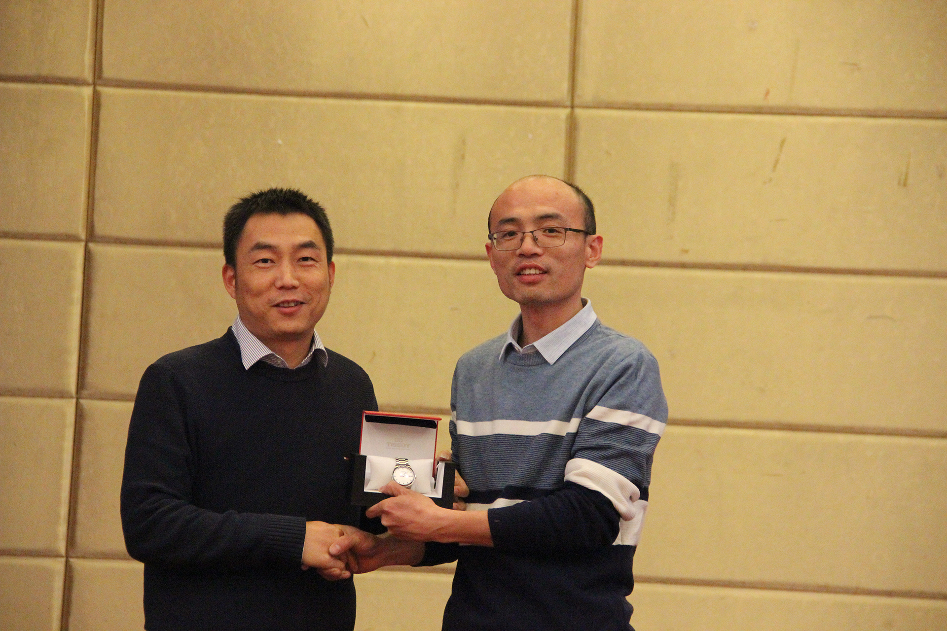 公司總經理為工作滿5年的老員工頒獎,恭喜獲得高級手表一只(員工因故未到現場,由主管代領獎品),感謝5年來,他的踏實工作,表現出了難能可貴的責任意識和奉獻精神,為公司創造出較好的企業效益或社會效益做出了極大貢獻。