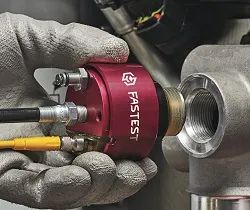 先用夾具連接尾部的兩個固定孔,把接頭固定在測試件上;施加先導氣壓膨脹密封圈進行密封;從測試孔通入測試介質;測試完畢后氣壓減小,密封圈回縮,進行下一測試件的密封。整個操作過程只需幾秒,自動化流程,無需手動操作。